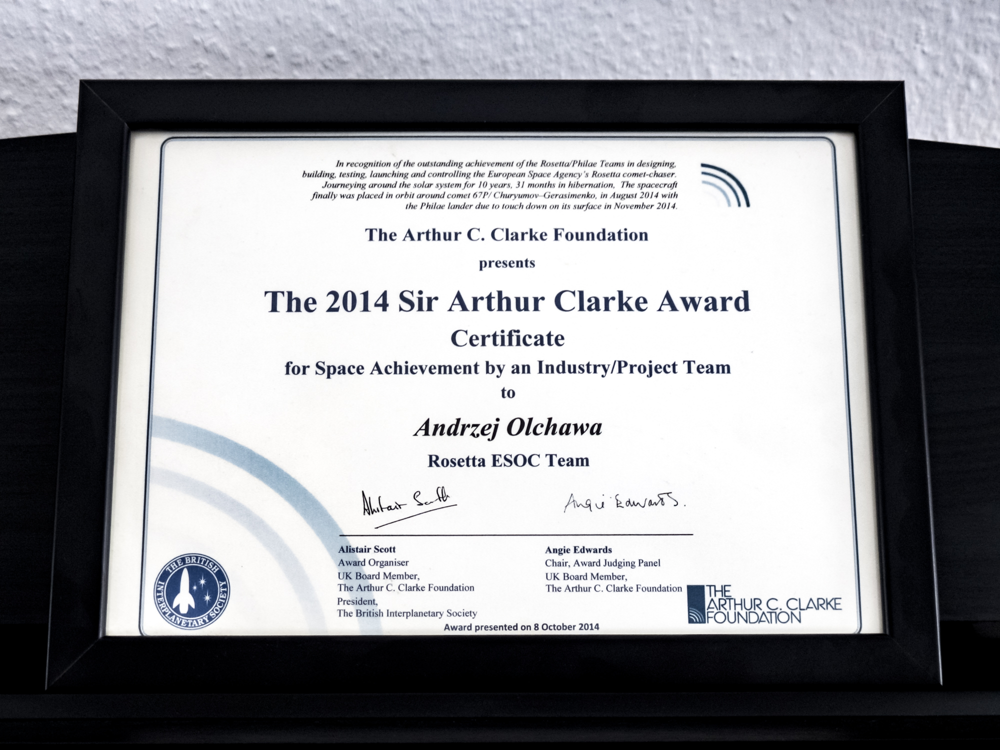 Recently, I finally opened and unpacked a moving box—the one I packed seven years and two moves ago. Inside, I found an award from The Arthur C. Clarke Foundation that I received back in 2014 for my contribution to the Rosetta mission. It moved me deeply as it brought back good memories.