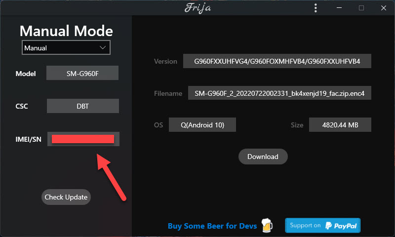 This step may vary depending on your phone model. For example, with the Samsung S9, you can use an application called Frija instead. Once started, we need to provide information about the model, CSC, and IMEI. This will then allow us to download the correct firmware for a specific Samsung phone.