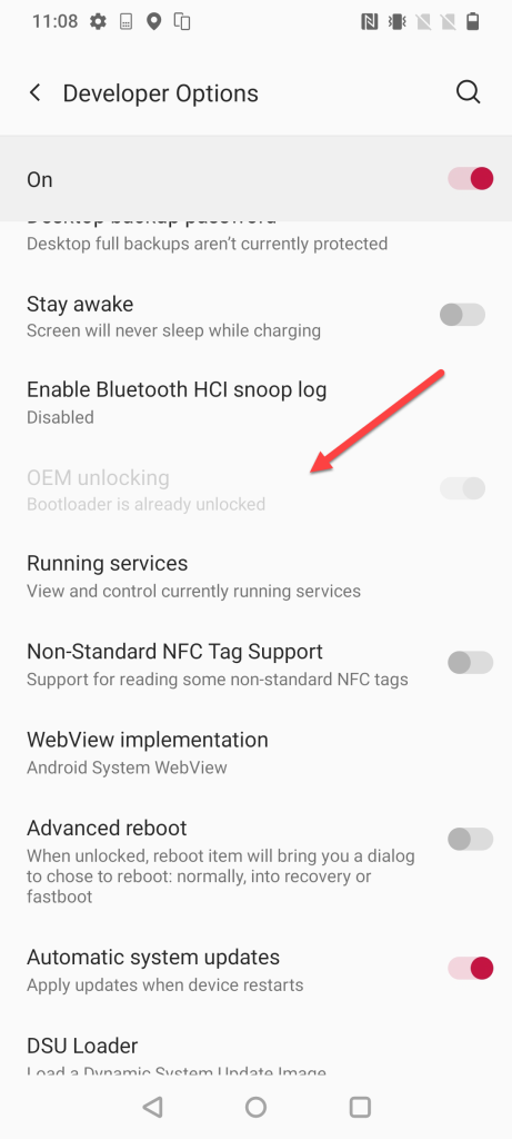 was already enabled, and the bootloader was unlocked, so the option appears grayed out.